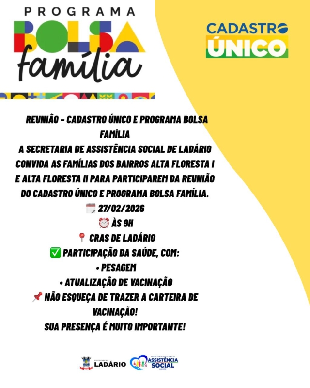 A Prefeitura de Ladário, através da Secretaria Municipal de Assistência Social, agendou uma reunião para o dia 27 de fevereiro de 2026, às 9h, no Centro de Referência de Assistência Social (CRAS). O evento é direcionado às famílias residentes nos bairros Alta Floresta I e Alta Floresta II e tem como principal objetivo fornecer orientações sobre o Cadastro Único e o Programa Bolsa Família.
